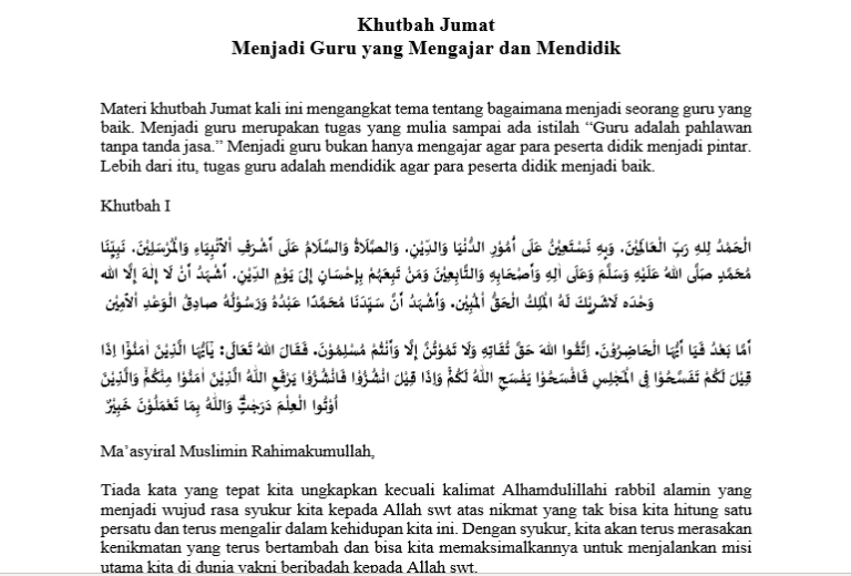 Materi khutbah Jumat kali ini mengangkat tema tentang bagaimana menjadi seorang guru yang baik. Menjadi guru merupakan tugas yang mulia sampai ada istilah “Guru adalah pahlawan tanpa tanda jasa”. Menjadi guru bukan hanya mengajar agar para peserta didik menjadi pintar. Lebih dari itu, tugas guru adalah mendidik agar para peserta didik menjadi baik.