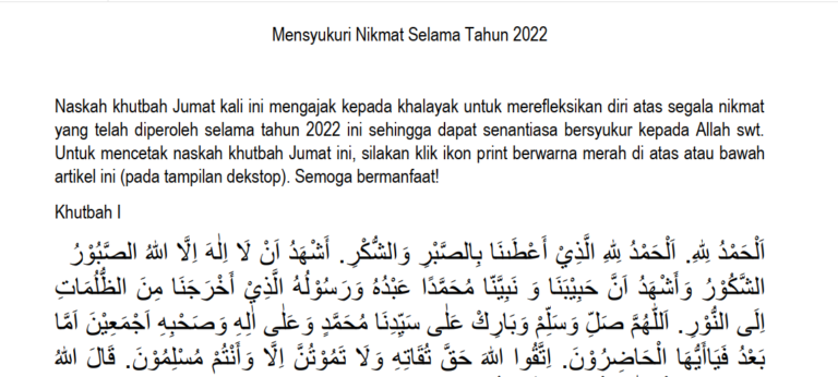 Naskah khutbah Jumat kali ini mengajak kepada khalayak untuk merefleksikan diri atas segala nikmat yang telah diperoleh selama tahun 2022 ini sehingga dapat senantiasa bersyukur kepada Allah swt. Untuk mencetak naskah khutbah Jumat ini,