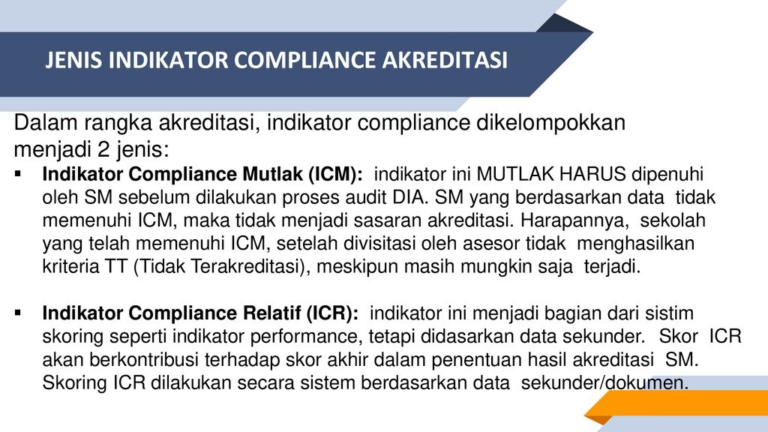Indikator Compliance Relatif (ICR) adalah indikator ini menjadi bagian dari sistem skoring seperti indikator performance, tetapi didasarkan pada data sekunder. Skor ICR akan berkontribusi terhadap skor akhir dalam penentuan hasil akreditasi sekolah/madrasah. Skoring ICR dilakukan secara sistem berdasarkan data sekunder/dokumen. Skala pengukuran ICR menggunsksn skala Likert (1,2,3 dan 4).