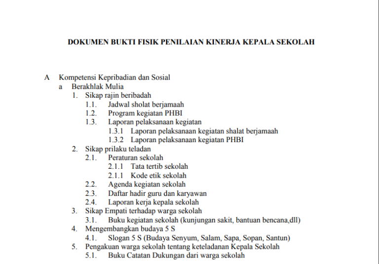 Dokumen Bukti Fisik Penilaian Kinerja Kepala Sekolah dan Madrasah – Penilaian kinerja kepala sekolah/madrasah merupakan proses pengumpulan, pengolahan, analisis, dan interpretasi data tentang kualitas pekerjaan kepala sekolah/madrasah dalam melaksanakan tugas pokoknya sebagai kepala sekolah/madrasah.